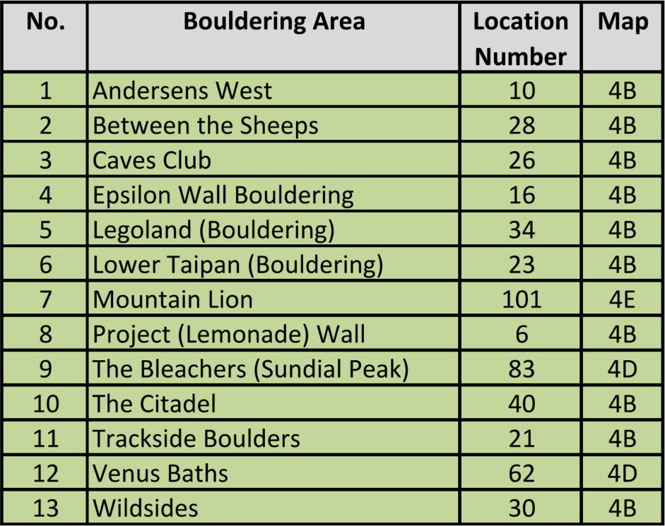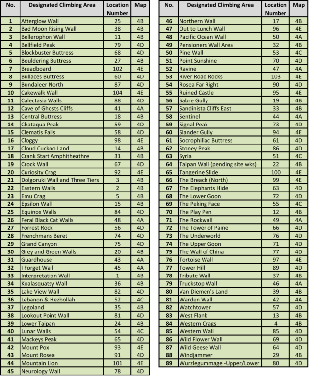 We are often asked this question. Here are the Parks Victoria lists of 13 Bouldering Areas and 89 Designated Climbing Areas, transcribed from the Greater Gariwerd Landscape Management Plan.