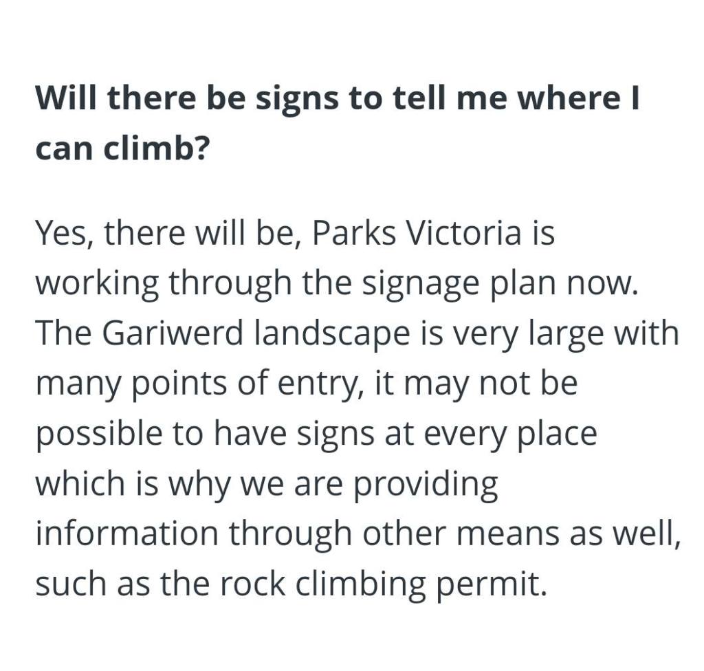 It appears unlikely that Parks Victoria would be prepared to issue a legal infringement notice should anyone be found to be bouldering or climbing outside the listed locations or in violation of any future permit conditions. Parks Victoria is relying on park users to “do the right thing”.