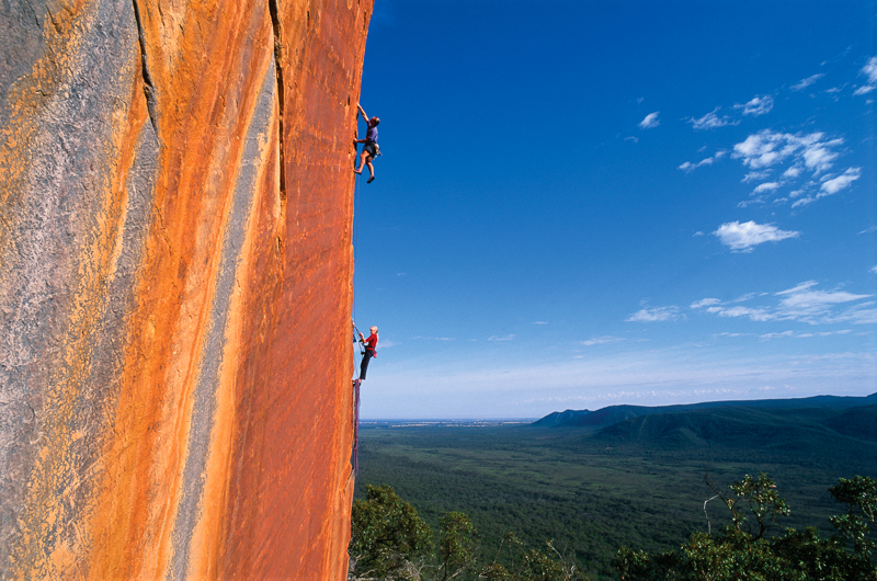 292-002-08 Published May 3, 2019 at 800 × 530 in 292-002-08 Steve Monks with Monique Forestier belaying on Bristol Fashion (pitch two, 26), Red Sail, The Grampians, Victoria, Australia.