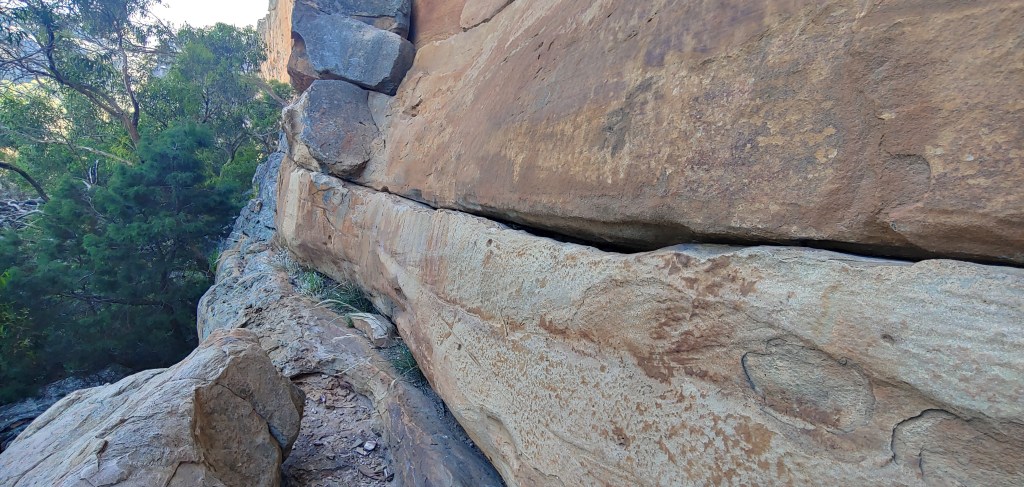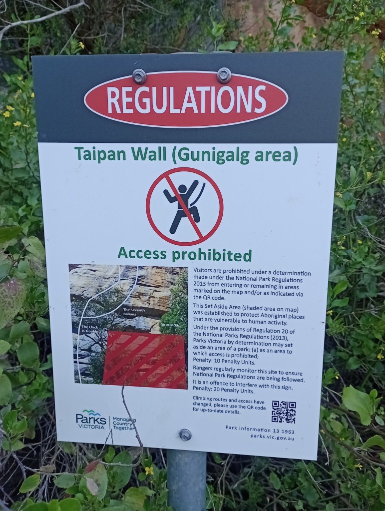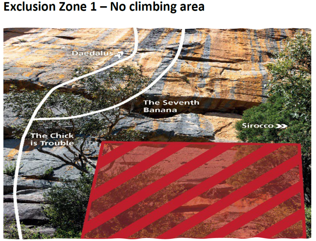The right side of Taipan Wall has been designated a NO ENTRY zone to protect locations where ancient rock breakages have been found. This Taipan (South) exclusion zone includes Spurt Wall. Further smaller exclusion zones are also indicated at several locations along the base of the Taipan left side open section.