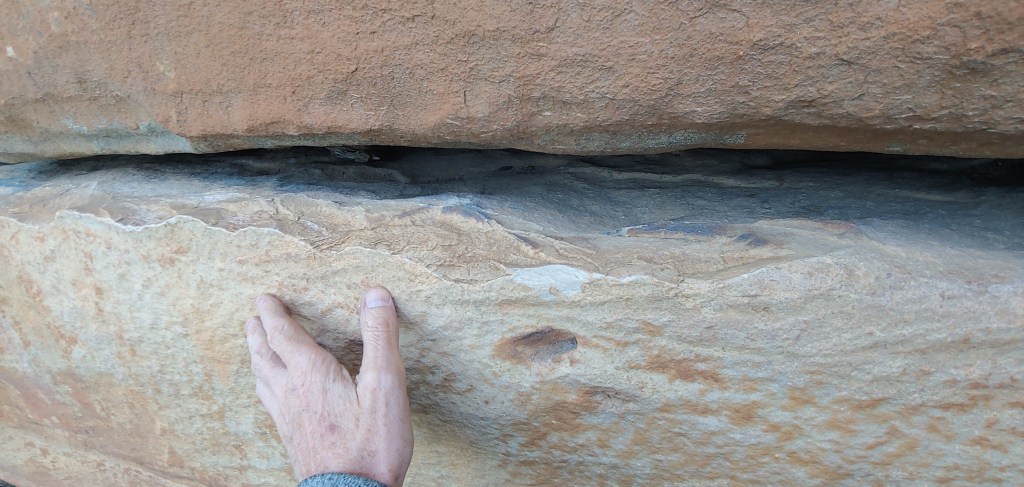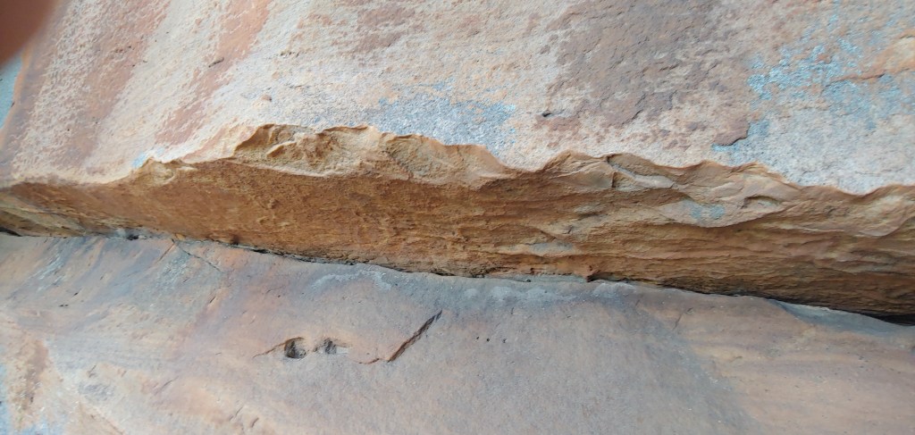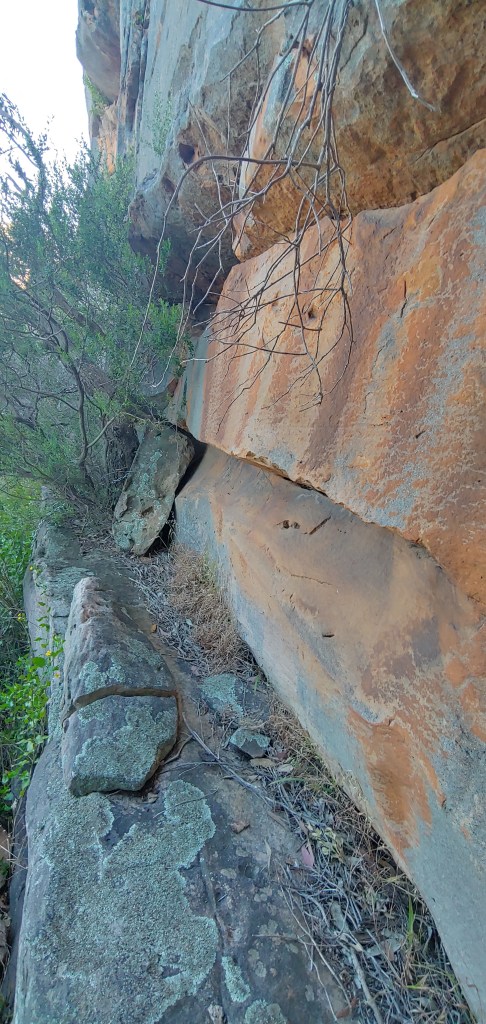 These photographs show the ‘quarrying’ rock scars below the route, Invisible Fist, believed to be the reason for the exclusion zone at Taipan Wall right side. The sharp edge of the rock shelf has been broken off in multiple locations to create small cutting tools, leaving a wavy, scalloped appearance to the edge of the rock. The resultant scars appear to be 5cm to 10cm in length. These markings have weathered over a long period of time to take up the same orange varnished colour as the surrounding rock.