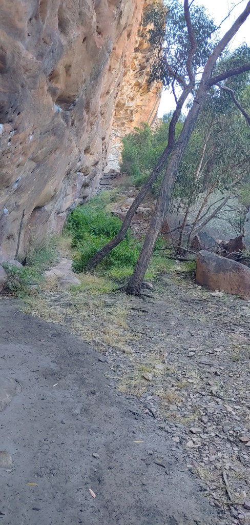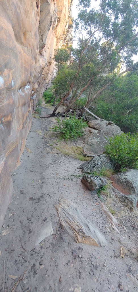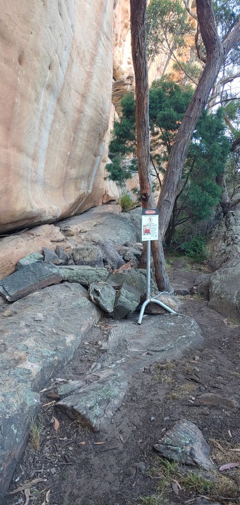 Below the route, Naja, a tripod sign has been placed on the footpath, discouraging access any further along the footpath to Taipan Wall right side and Spurt Wall