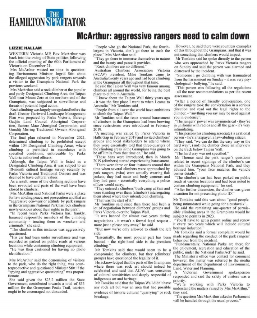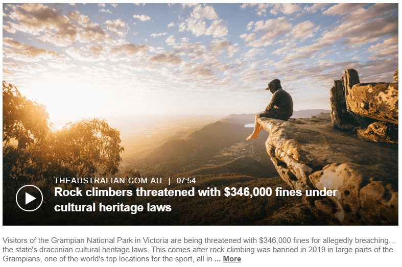 The Australian revealed this week that a climber had been visited twice at their property by a First Nations-State Relations investigator who wanted to question them after their car was spotted in the Grampians National Park, where much of the best climbing routes have been banned due to cultural heritage reasons.