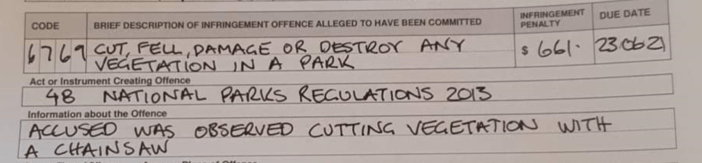 To issue a ticket, the authorised officer (park ranger) must allege an “offence” under a specific clause of the relevant legal instrument, The National Parks Regulations 2013. These regulations are utilised to enforce The National Parks Act 1975.
