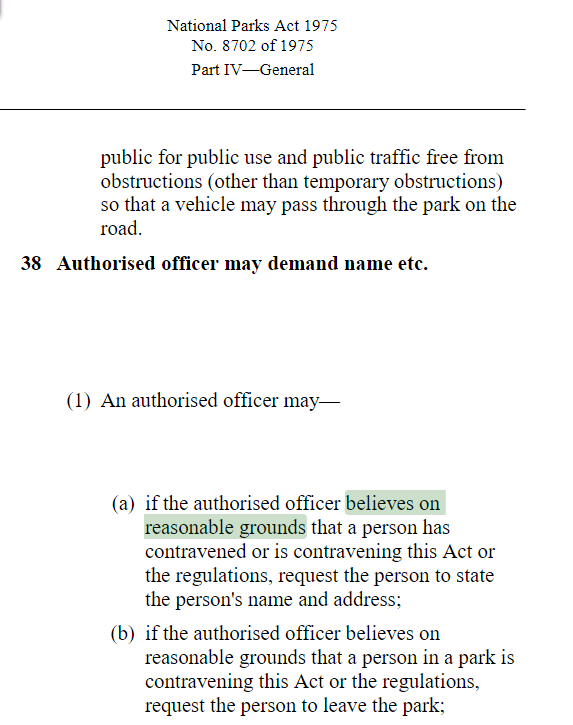 • The ranger must first produce formal identification before proceeding. Take a photograph of both sides of the ranger’s ID card. The card must show that the ranger is an authorised officer under the National Parks Act 1975. We understand that most rangers are suitably authorised.