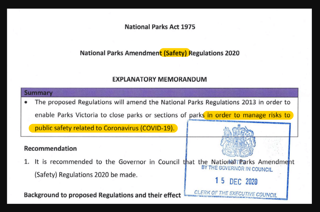 It would appear that the only “offence” that could be alleged by Parks Victoria would be disobeying park rules, as defined within the management plan (a plan, not an Act). Such an allegation would be open to challenge in the Magistrates Court in the same way a person would challenge an inappropriate traffic infringement notice. Do the park rules have a legal and valid purpose if interference or harm does not occur and cannot be plausibly alleged?